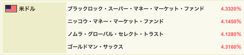 SBI証券で米ドル建ての「外貨MMF」の商品を見てみましたら、現状の利回りは4%程度でした。