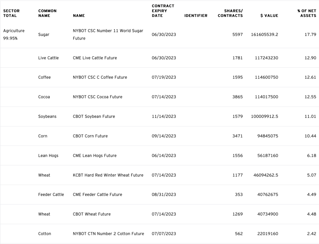 2023年4月26日時点では、砂糖、生牛、コーヒー、ココア、大豆、トウモロコシの割合が大きいですが、幅広い商品に分散してありますね。
