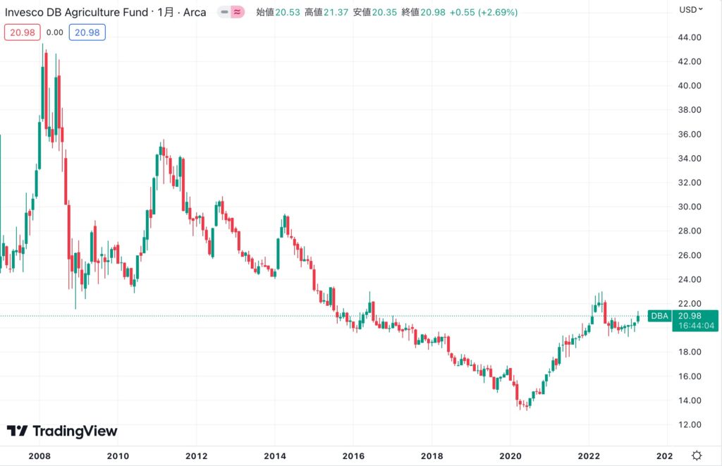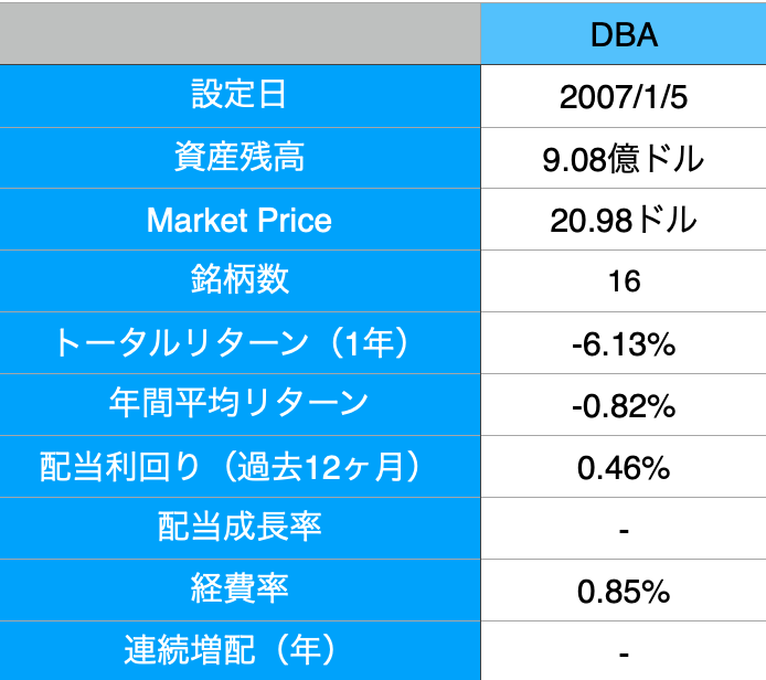 インベスコDBアグリカルチャー・ファンド(DBA)は、Invesco Distributors, Inc. が設定・運用する上場投資信託(ETF)で、DBIQ Diversified Agriculture Index Excess Returnに連動する投資成果を目指し、流動性が高く、広く取引される農産品11の先物契約で構成される。また、米国財務省証券およびマネーマーケット収入からの金利収入もある。