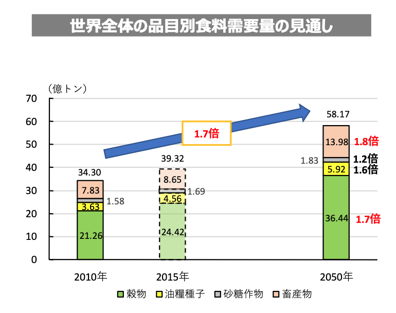 農林水産省の資料を確認してみましたが、2050年には穀物が1.7倍、畜産物では1.8倍の見通しとなっておりますね。