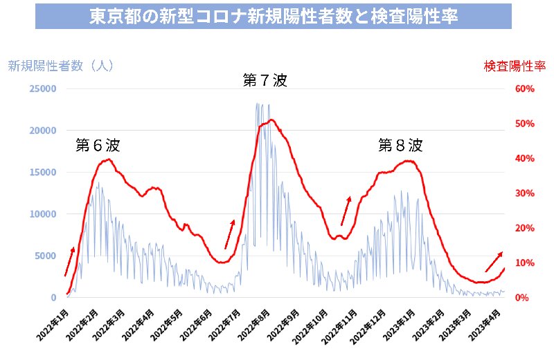 JTBの「2023年ゴールデンウィーク(4月25日~5月5日)の旅行動向」によると、国内旅行者は2450万人の予定で、コロナ前の2019年と同水準まで戻っているようです。ただ、COVID-19は完全に収束したわけではありません。4月25日時点では、COVID-19の新規感染者数は1万2475人で、重症者数は59人。上図の通り新規感染者は緩やかに増加傾向にあり、新型コロナウイルス感染症対策アドバイザリーボード(厚生労働省にコロナ対策を助言する専門家有志)は、2022年12月~2023年1月の第8波を超える第9波が起こる可能性があるという見解を示しています。