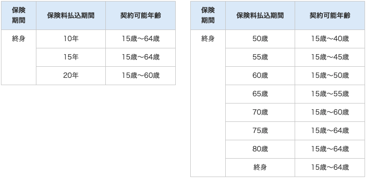 払込期間:10〜20年払済、50〜80歳払済、終身払 から選択(年齢によって異なる) ※1