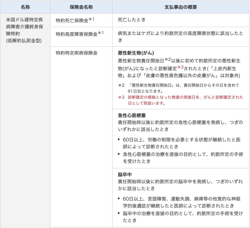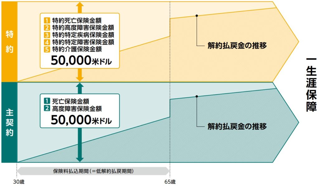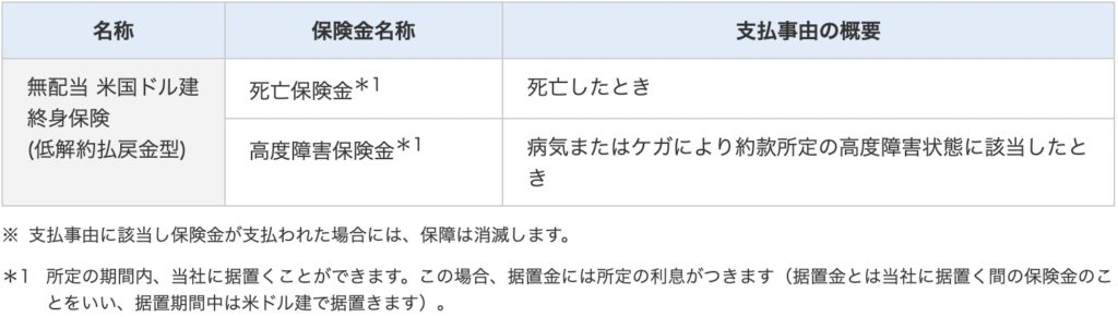 正式名称:無配当 米国ドル建終身保険(低解約払戻金型)・米国ドル建特定疾病障害介護終身保険特約