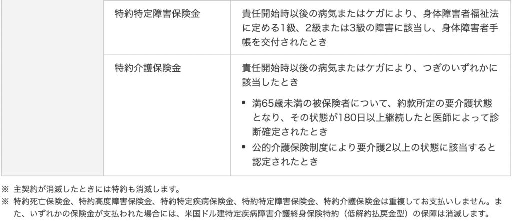 主契約は普通の低解約返戻金型の米ドル建終身保険なので同社の「US RISE」と同じです。それに「米国ドル建特定疾病障害介護終身保険特約(低解約返戻金型)」という超絶長ったらしい名称の特約を付加したのが本商品です。この特約がメインで名前の通り、死亡、高度障害、三大疾病、障害、介護になった時に保険金が受け取れる終身保険を付加することができます。保険金は一度しか受け取れないのでどれかに該当すると特約は消滅します。また保険料免除特則を付けておくと主契約の保険料も免除されます。