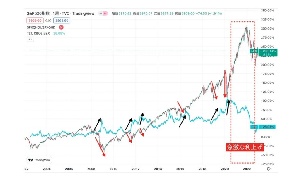 なお、2022年にTLTの価格が上昇しなかった理由は、世界の主要中央銀行が急激な利上げを続けたために債券の利回りが上昇し、債券価格が下がったからです。