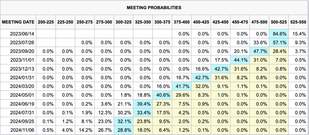 5月11日の記事でもFRBの政策金利の市場予測を取り上げていましたが、その時よりも6月FOMCでの利上げ確率が上昇しておりますね。