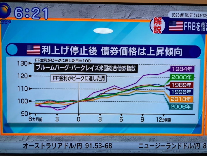先週、Newsモーニングサテライトでは、利上げ停止後、債券価格は上昇傾向にあるとのデータを取り上げておりました。