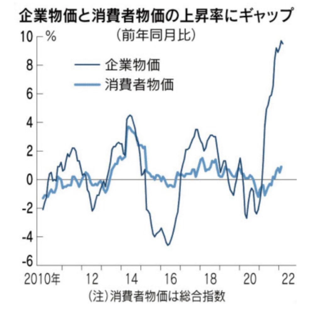 2022/05/16のブログ企業物価10%上昇「値上げが止まらない」では、「消費者物価」と「企業物価」には大きな乖離があるので、各企業は「企業物価」の上昇分を商品に転嫁せざるを得なくなってくるとお伝えしておりますし、