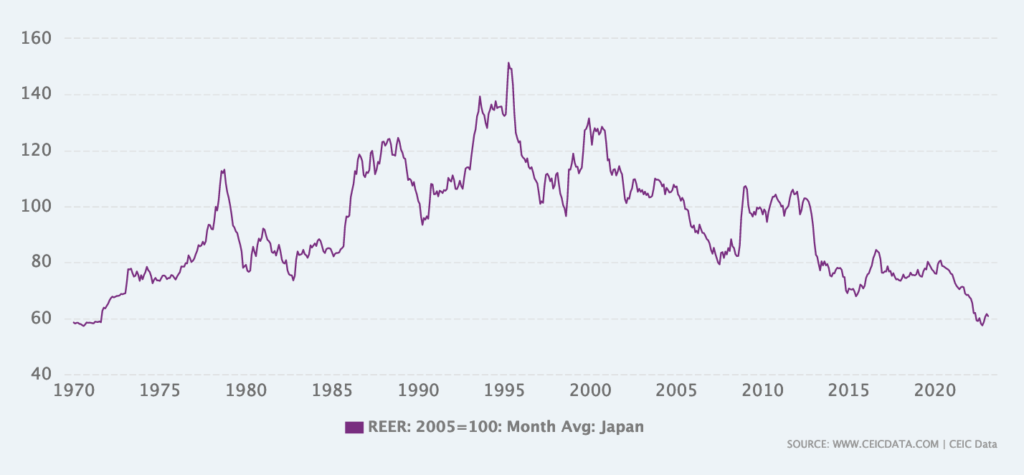 下グラフは「実質実効為替レート」を表しているものですが、上にいくほど「円高」、下にいくほど「円安」を示します。