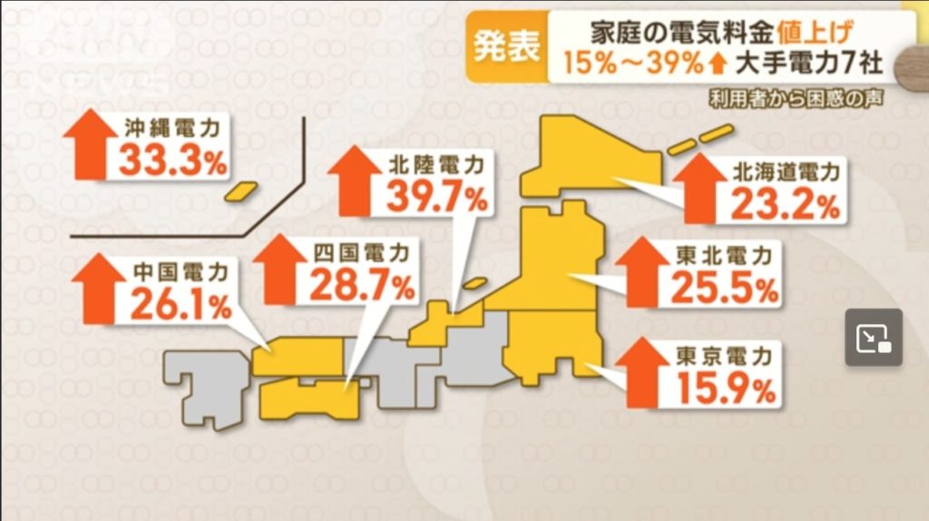 東京電力は平均15.9%の値上げ。北海道電力は平均23.22%、東北電力は平均25.47%、北陸電力は平均39.7%、中国電力は平均26.11%、四国電力は平均28.74%、沖縄電力は平均33.3%の値上げとなります。