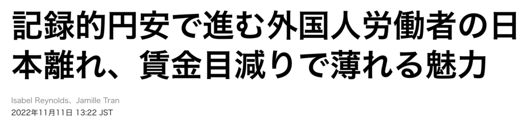 しかしながら、円安が続き円の価値が低下し続けた場合、外国人労働者が日本で労働することのメリットは低下し、他国に行ってしまう可能性があります。