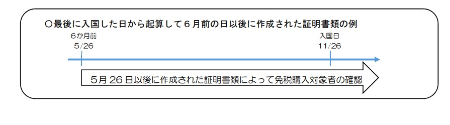 日本国籍を有する者に対して免税販売を行う場合、その者が最後に入国した日から起算して6月前の日以後に作成された、その者に係る領事館の「在留証明」又は「戸籍の附票の写し」(以下合わせて「証明書類」といいます。)の提示を受けて、国内以外の地域に引き続き2年以上住所又は居所を有することの確認を行う必要があります。なお、証明書類の作成日時点において、「国内以外の地域に引き続き2年以上住所又は居所を有すること」が確認できる必要があります。