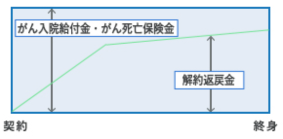 2つ目は、保障内容こそ個人で加入するがん保険とほとんど変わりはないですが、よく言われる「法人がん保険」というのは下記の図のように終身保障で解約返戻金があります。