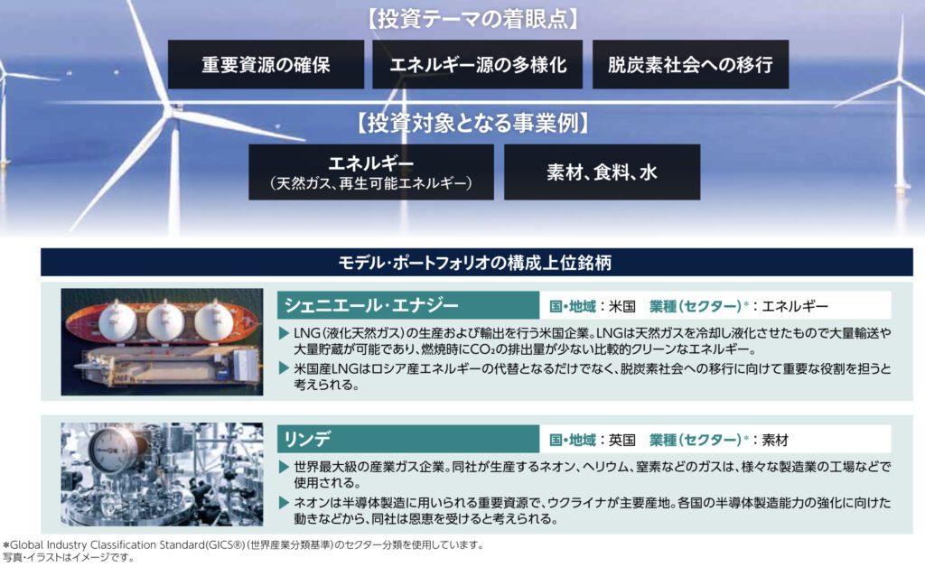 をテーマにエネルギー(天然ガス、再生可能エネルギー)素材、食料、水の分野へ投資をしていくようです。モデルポートフォリオに入っている2銘柄をイメージしてください。