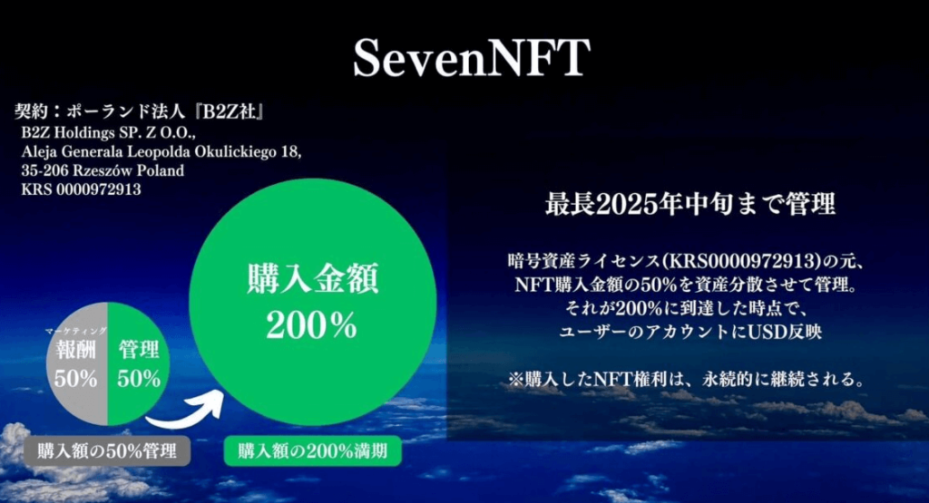 NFT(Non-Fungible Toke)は非代替性トークンと呼ばれています。これだけだと何のことか分かりませんが、一言でいうと資産価値を持つデジタルデータと考えてください。例えばデジタルミュージックやデジタルアート、トレーディングカードなどが当てはまり、独自のマーケットで取引を行うことができます。つまりデータを購入させらるのです。そのうちの50%を運営会社が運用。運用は最大で2025年の契約満期まで続き、資産が200%を超えるまで投資&管理をセブンソサエティが行います。そして返還されるときはビットコインでの返還となります。
