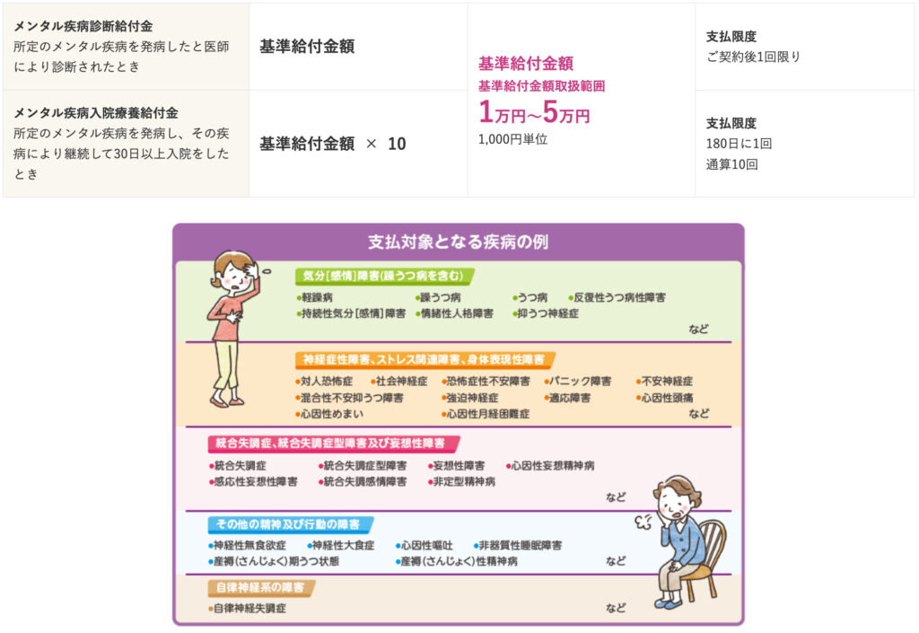 所定のメンタル疾病と診断されたときや所定のメンタル疾病により継続30日以上の入院をしたとき、給付金を受け取れます。