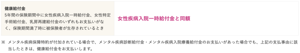 - 女性疾病で一時金、健康なら5年毎に祝金がもらえる保険