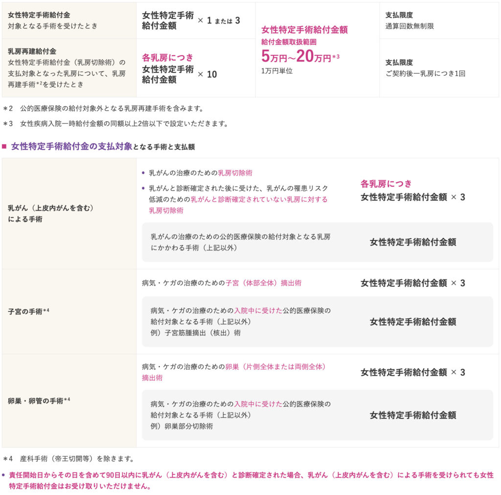 女性特有の病気になると一時金、健康なら5年毎にお小遣い。といういかにも女性が好きそうな保障内容ですね。確かに女性の方が長生きですし、病気にもなる確率も高いですが、それなら普通の医療保険でいいと思います。保障内容を一緒に確認していきましょう。
