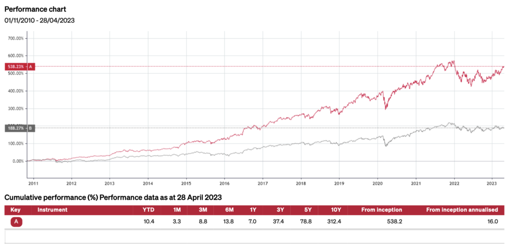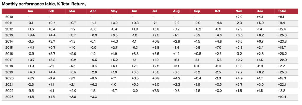 今回はヘッジファンドの運用がポイント。運用開始時の基準値を100として開始、算定日にそれ以上になるかどうかが重要になります。このヘッジファンドですが運用成績が優れています。2022年はマイナスになったものの、それ以外はずっとプラス。なんと14年間で13年がプラスです。2023年も4ヶ月で10%以上出しているのです。リターンを出すときも10%を超える年が多いので、今後も期待できるといえます。
