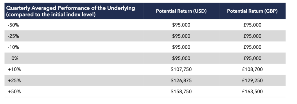 上記はUSD100,000、GBP100,000を投資した場合の試算表。特にGBPの場合、参加率137%なのでファンドのリターンが上昇すればするほど、それだけリターンも大きくなります。満期まで保有し続ける必要はありません。高いリターンと判断したタイミングで利益確定していくのがポイントです。(満期まで持つのは株価が下がった時のみがベター)