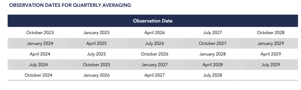 四半期ごとにある算定日に、算定基準であるヘッジファンド運用が運用開始時の数値(100%)以上になっているかどうかを判断します。最大でも−5%の損失リターンが出た場合は37%増というのが大きなポイント。下記がその日程です(日付は伏せてあります)。
