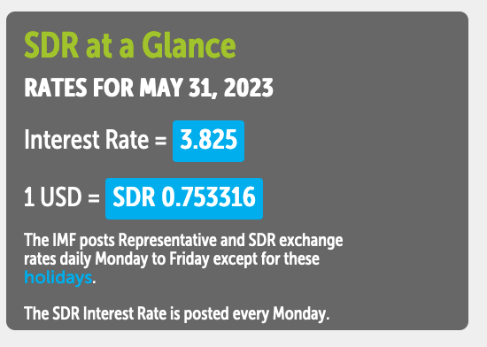 そして、SDRの価値はこれら各通貨量の価値をそれぞれドル換算したものの合計であり、本日のその値や換算相場は以下のとおり。
