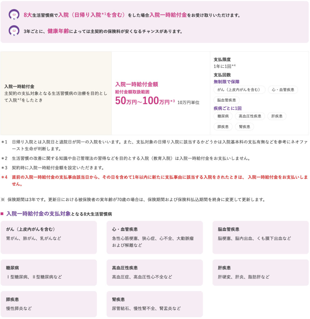 8大生活習慣病で入院をすると入院一時給付金を受け取ることができます。保険期間は3年更新型で最大70歳まで、70歳時点で保険期間を終身に切り替えて保険料も固定にできます。3大生活習慣病(がん、心・血管疾患、脳血管疾患)の場合は、入院一時給付金を1年に1回を限度とし無制限で受け取れます。それ以外の疾病(糖尿病、高血圧性疾患、肝疾患、水疾患、腎疾患)は1回が限度です。