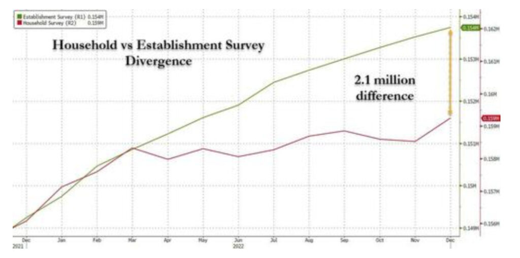 実際、「家計調査」では2022年の大半は新規雇用がほとんどなかったのに、「事業所調査」では同じ期間に200万人以上の新規雇用が増えたとされています。