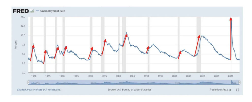 以前、リセッション(景気後退)と投資戦術の記事で、失業率が上昇していく段階でもリセッション(景気後退)に陥っていることが確認できるとお伝えしましたが、