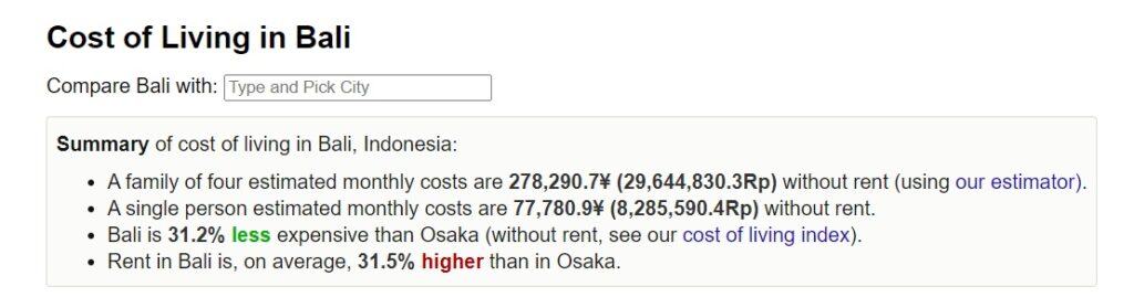 カンボジアの例です。家賃も日本より下がるので一人暮らしの場合15万円以下で生活できそうです。南国のリゾート地といえば、インドネシアのバリ。ここはどうでしょうか