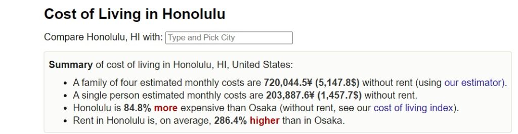 東南アジアとはいえ、シンガポールは高いですね。家賃が4倍程度のなるのも痛いところ。一方米国はどうでしょうか。米国は住む場所により費用が全然違いますので、人気のハワイのホノルルをチェックしましょう。