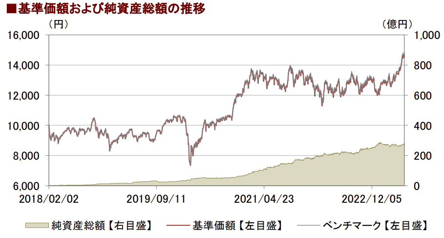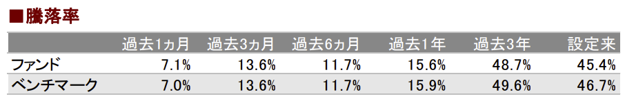 直近1年で+15.6%、3年で+48.7%の騰落率になります。ベンチマークは日経平均トータルリターン・インデックスになります。