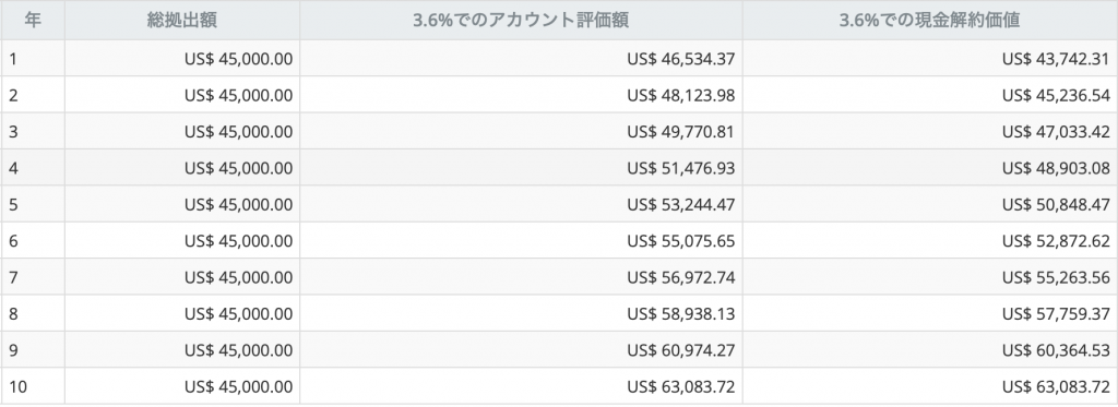 USD45,000投資すると、固定金利ですので10年後のUSDベースでの金額はUSD63,083.72と確定しております。