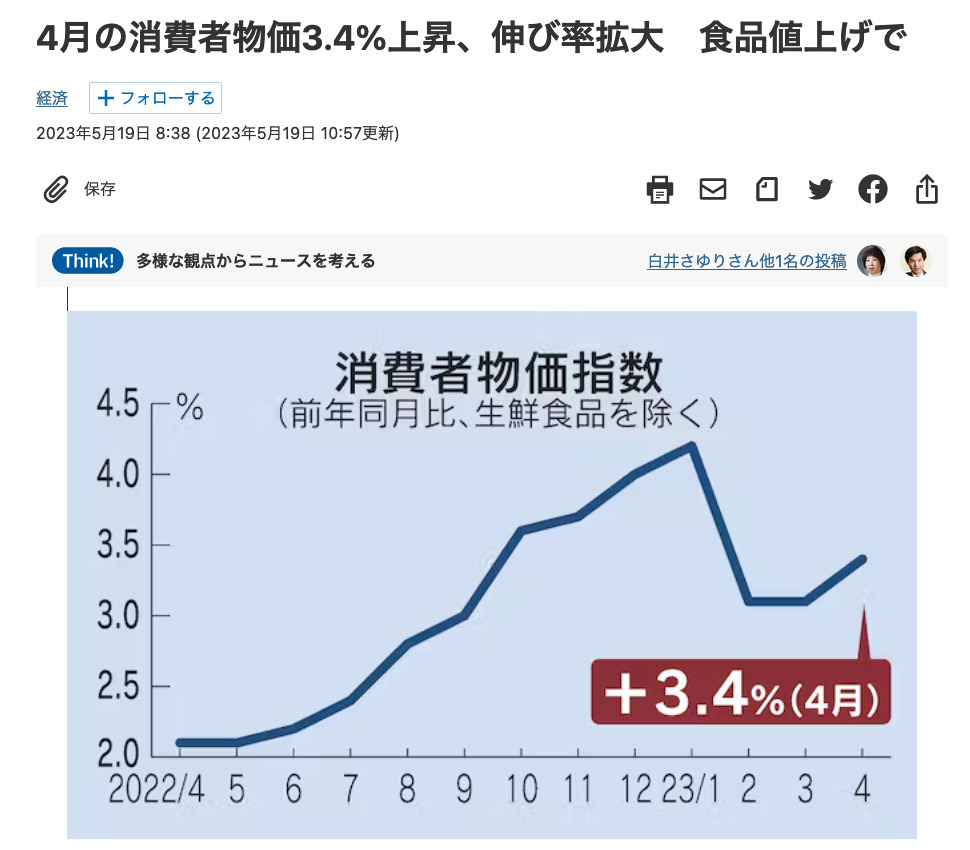例えば、日本でも物価上昇が続いておりますが、4月の消費者物価指数は、変動の大きい生鮮食品を除く総合指数は前年同月比で3.4%上昇しましたから、