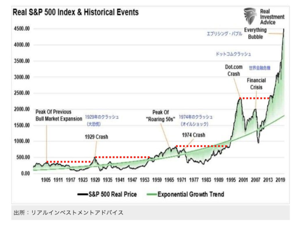 なお、S&P500インデックスも確かに年率10%程度のリターンですが、元の高値に戻すまでに10〜20年間かかった(ITバブル崩壊後は約13年)ことが何度かありますので、それを踏まえた上で、投資先を選択してくださいね。