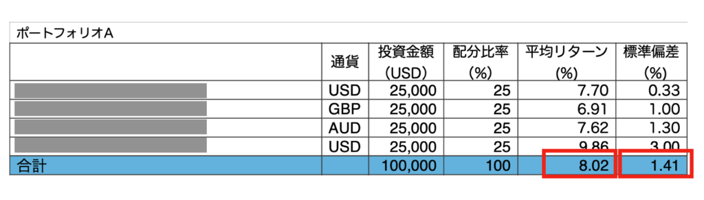 例えば、以下は昨日クライアントへ提案したオフショアファンドで構築したポートフォリオの1つですが、年率8%台の平均リターンを上げています。