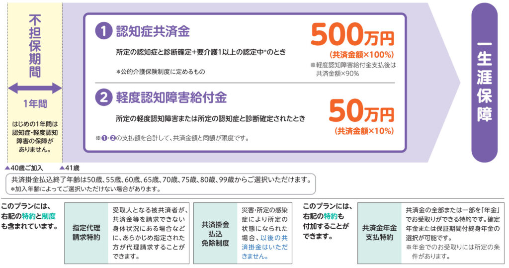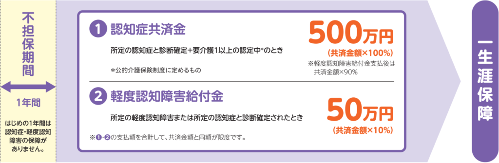 認知症の為だけの保険です。保障は一生涯ですが、死亡保障はなく、解約返戻金もありません。また加入してから1年間は不担保期間があるので、この期間に認知症になっても共済金は受け取れません。