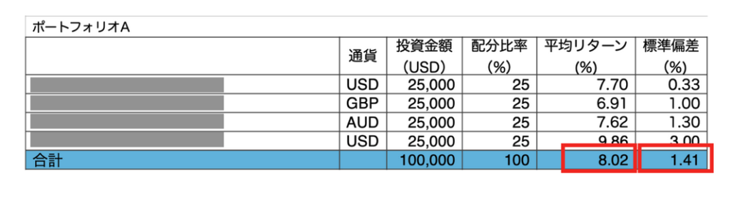 ちなみに、高い利回りを求めようとすると一般的には高いリスクの商品で運用する必要がありますが、リスクの低いファンドでポートフォリオを構築しても利回り8%は達成できますね。