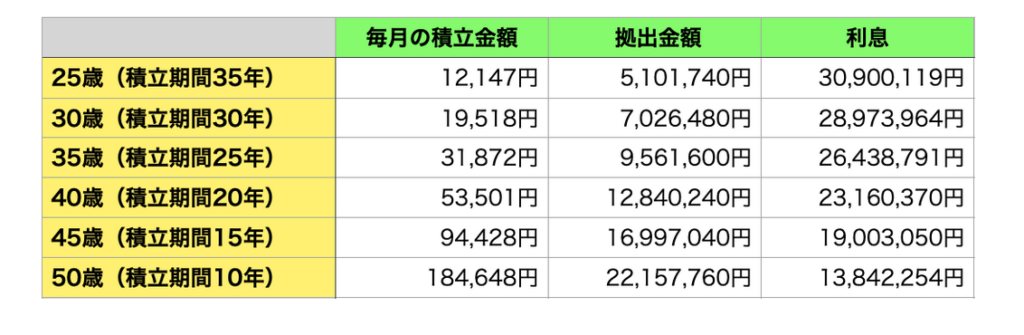 現在25歳の方であれば、毎月の積立金額は12,147円で良いわけですね。