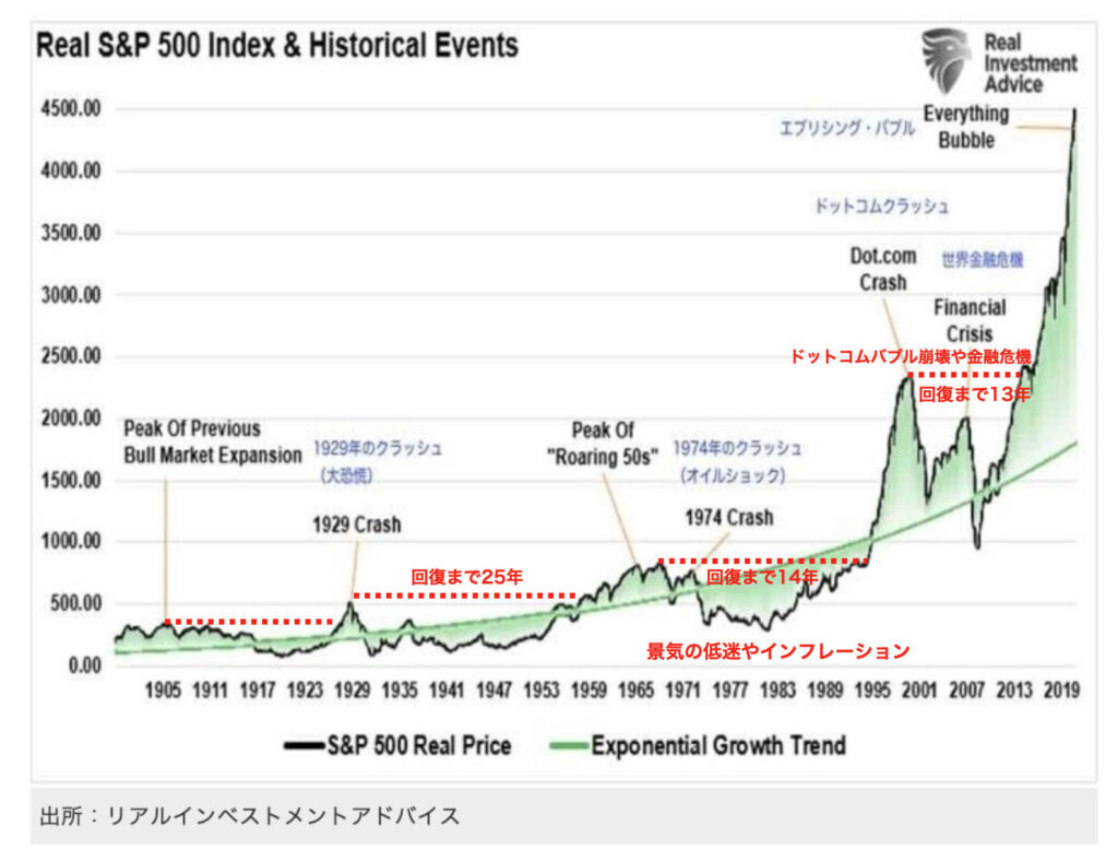 しかも株価の暴落後、株価が元の高値まで戻るのに10年、20年といった長い時間を要していることです。