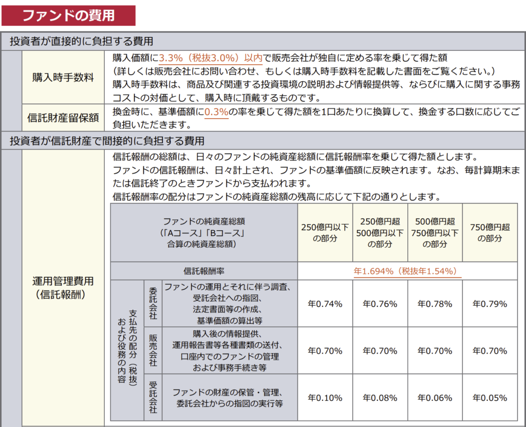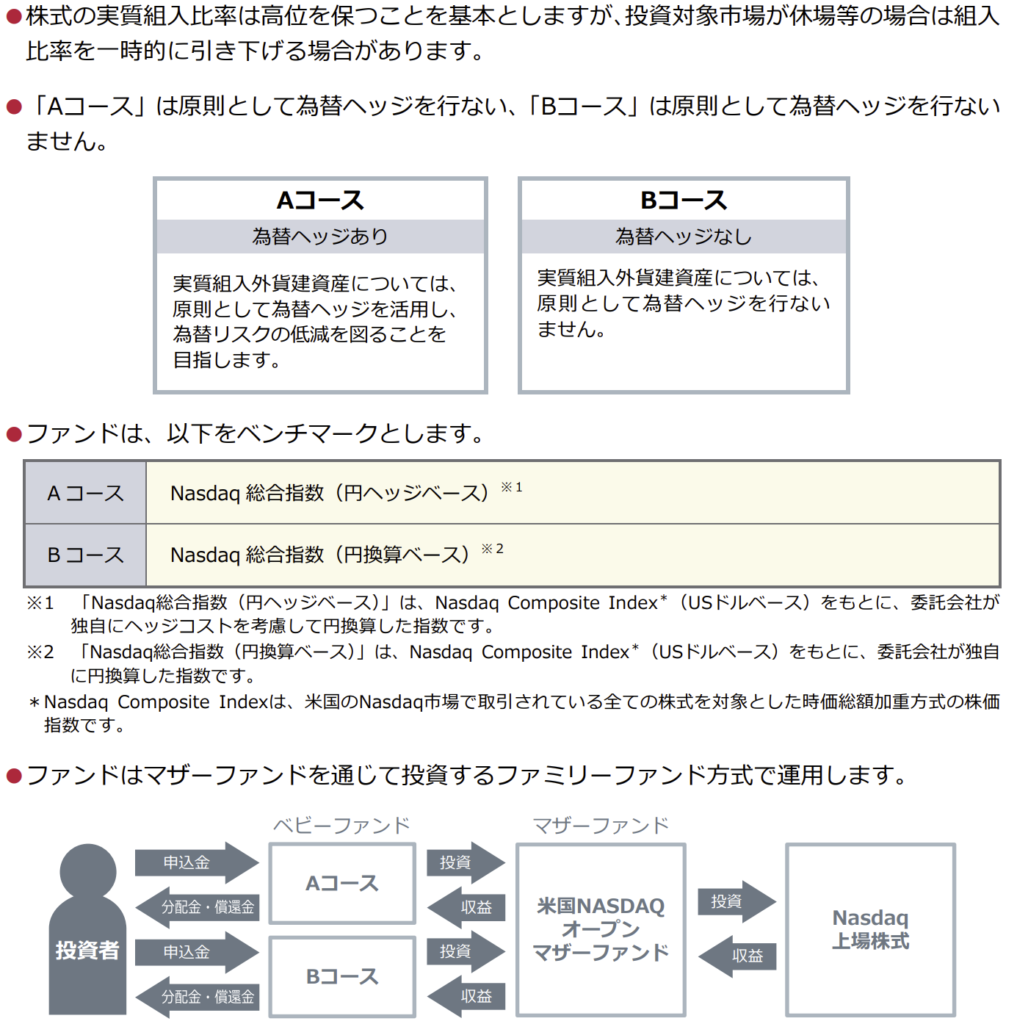 インデックスファンドではありませんので注意が必要です。またこちらのファンドはAコースの為替ヘッジありとBコースの為替ヘッジなしのコースがあります。今回はBコースの数値を使って解説していきます。
