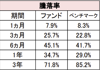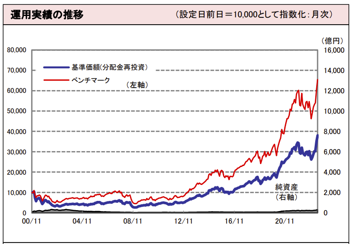 直近1年で+34.7%、3年で+71.8%の騰落率になります。ベンチマークはNASDAQ総合指数(円換算ベース)になります。またこちらのファンドは分配金が出ます。年によりますが、直近は1万口当たり550円~950円程度が実績となります。