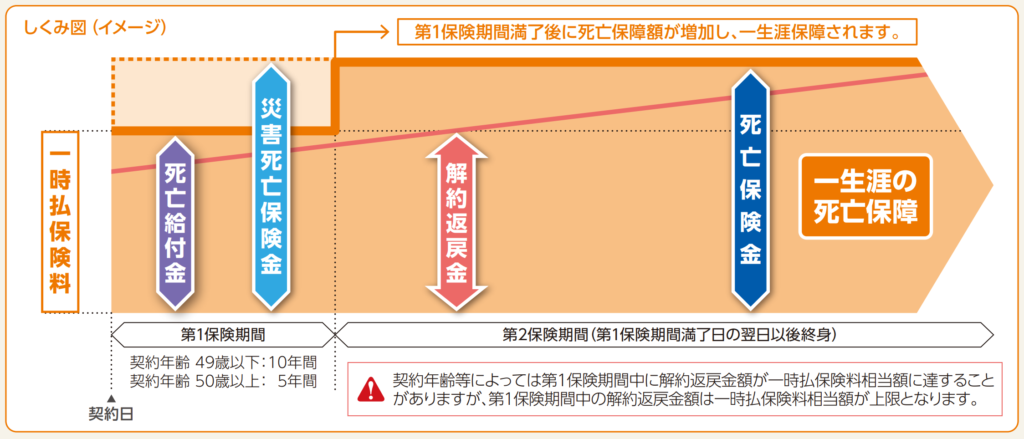 一時払の円建終身保険です。予定利率は契約時の利率で決まります。第1保険期間中の死亡は「支払った保険料」が保険金として支払われます。災害死亡の場合は基本保険金額が支払われます。第1保険期間終了後は基本保険金額まで死亡保険金が立ち上がるようになっています。健康上の理由で告知のある保険に加入できないけど死亡保障が欲しい人にとっては選択肢になります。あとは寝かしておくと予定利率に応じて解約返戻金が増えていくイメージです。ただ、利率低すぎるのでほぼ増えません。