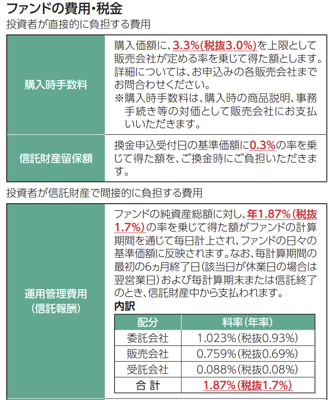 購入時手数料は3.3%、売却時は0.3%、毎年の管理費用は年率1.87%程度かかります。