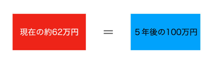 同じように「5年後の100万円」を現在価値に直した場合は、約62万900円となります。