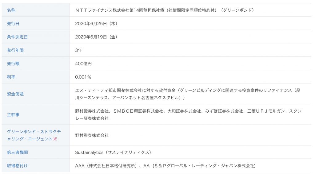 まだ金利、格付けも出てきていないので、また後日更新します。今は前回発行したグリーンボンドの条件をおさらいしておきましょう。