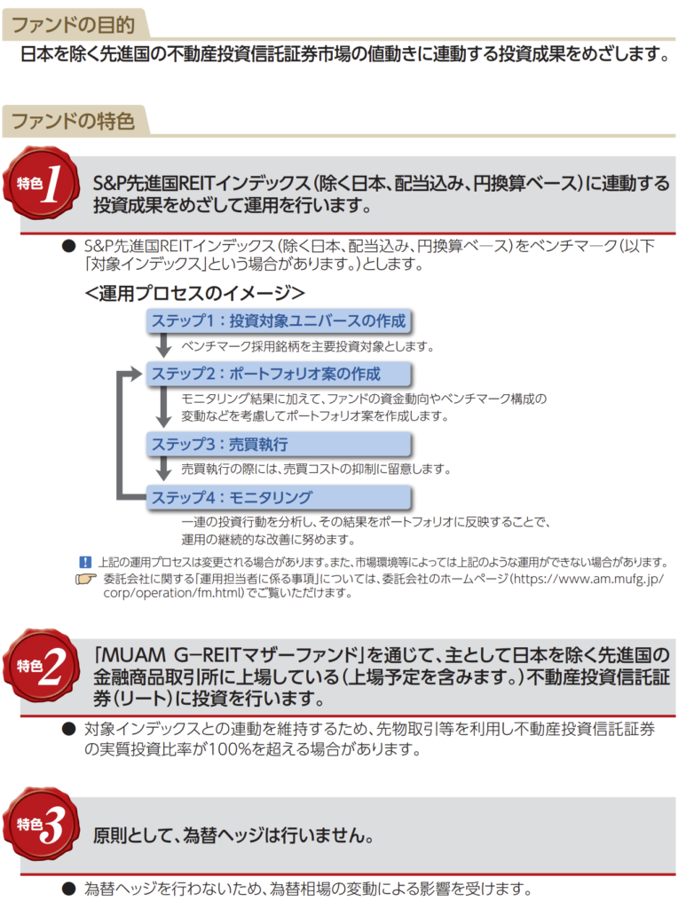 インデックスなので指数連動です。S&P先進国REITインデックス(除く日本、配当込み、円換算ベース)が対象インデックスになります。