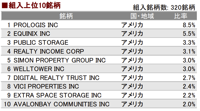 国別比率では米国が75%以上となっていて、組み入れ上位は物流、データセンター等が多いですね。