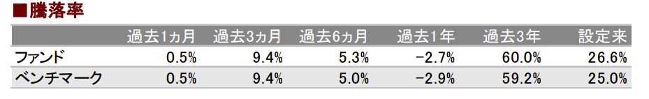 直近1年で-2.7%、3年で+60.0%の騰落率になります。ベンチマークは先ほど触れたS&P先進国REITインデックス(除く日本、配当込み、円換算ベース)になります。