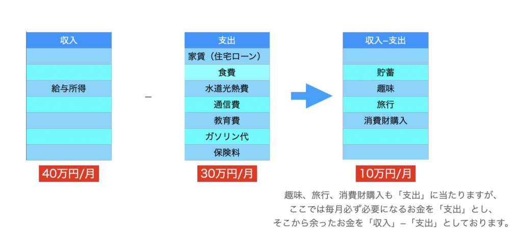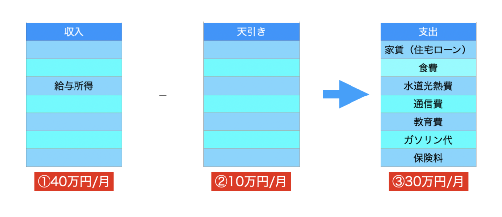 ②そこから、家のローン(もしくは家賃)や食事代などの生活費が支出として出ていき、